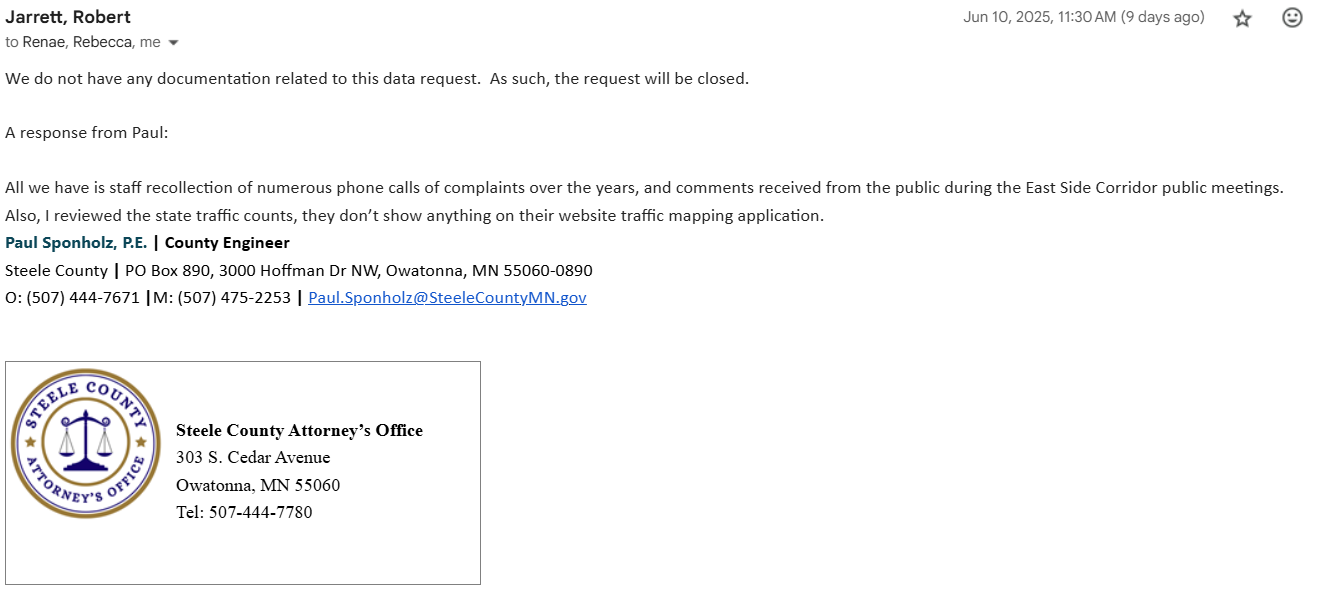 Steele County Attorney Robert Jarrett confirmed receipt of the preservation request and acknowledged the related data complaint. He stated that the County would respond to data requests in the order received and indicated more data may be available from the initial request.