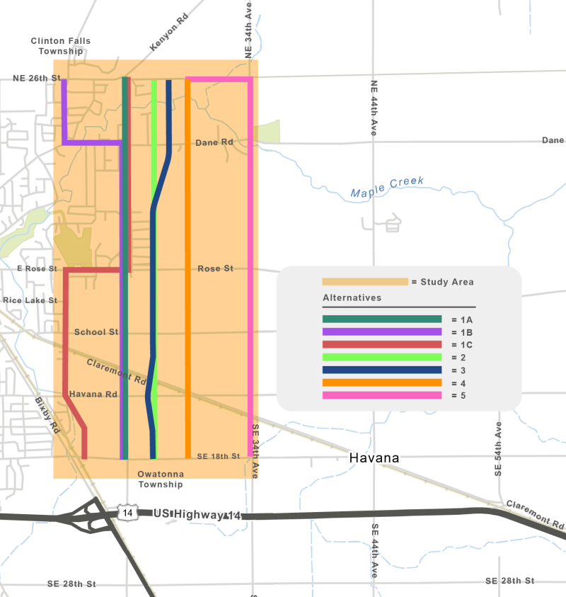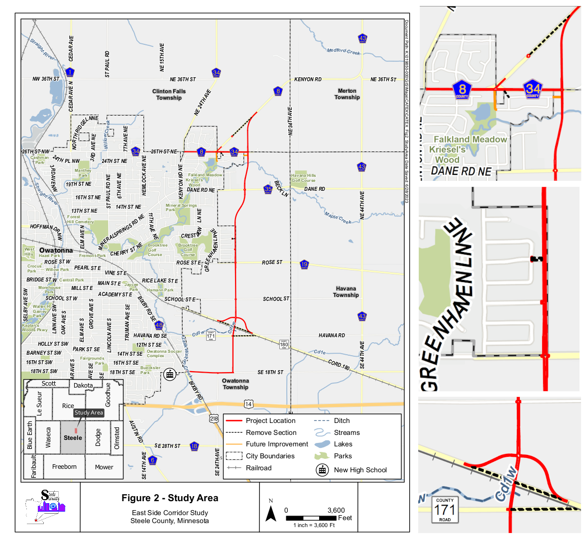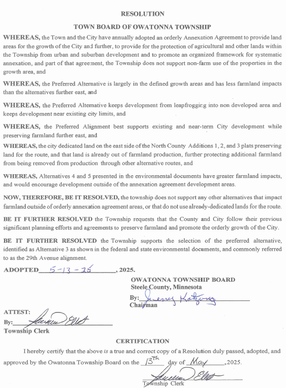 Need for Corridor: The City and County cited a need for a new corridor closer to Owatonna to accommodate traffic between the northeast side of town, the new high school, and Federated Insurance, as well as to reduce pressure on downtown routes. They claimed that some roads—such as Mineral Springs Road—were approaching capacity; however, available traffic studies do not support these claims. While 44th Avenue was expected to help traffic bipass Owatonna, it remains incomplete, so it’s unclear whether it would provide meaningful relief.Â