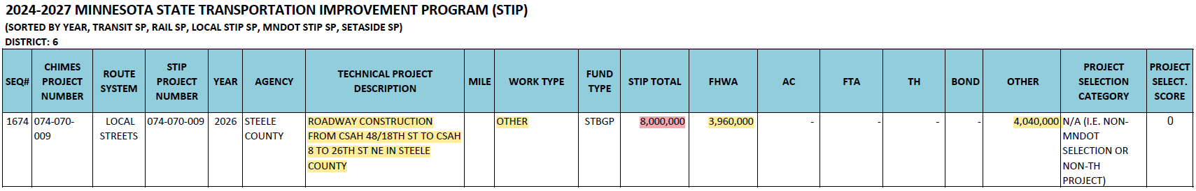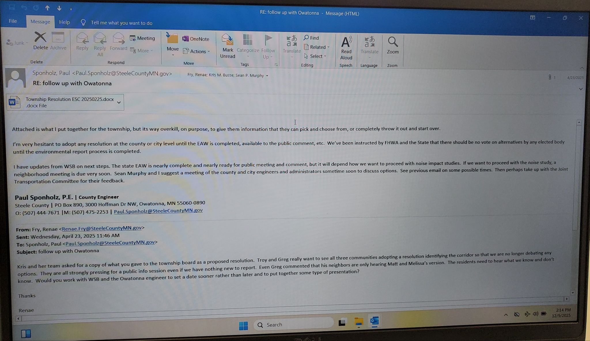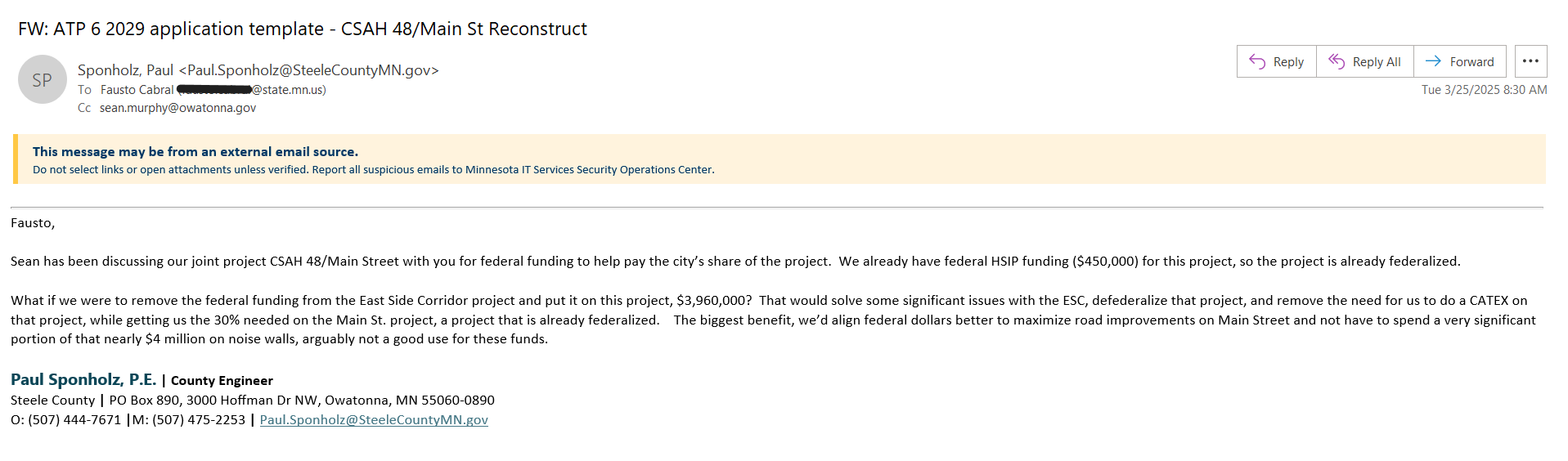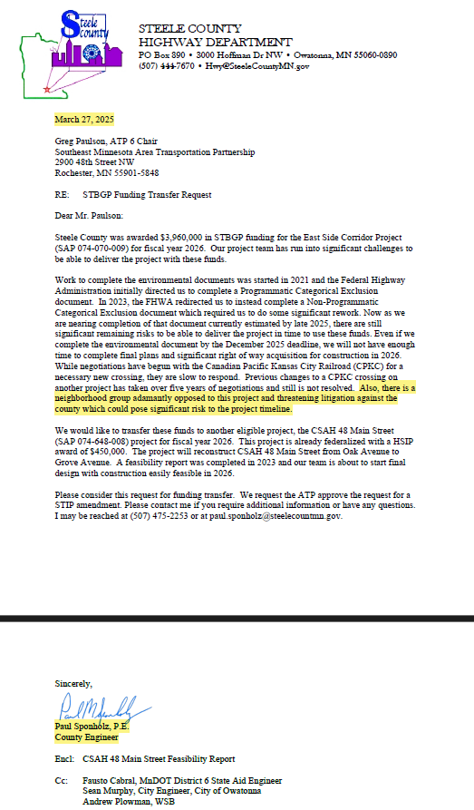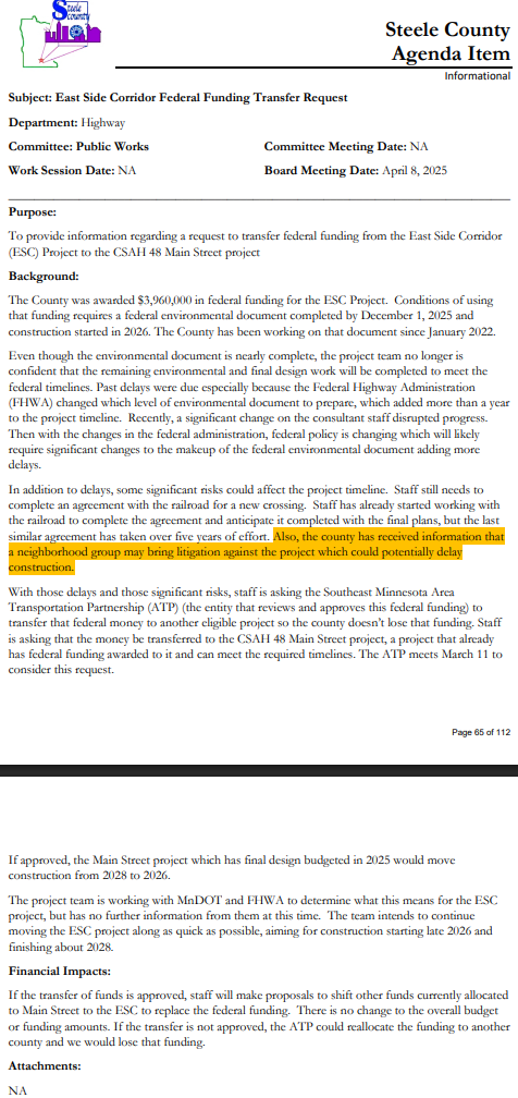 Funding Efforts: All city council members and Steele County Commissioners voted to seek additional funding for the trail alongside the ESC. While the commissioners and the chamber of commerce specified the ESC from 29th Ave, the city's letter listed the project as 29th Ave, raising residents' concerns that this misalignment could hinder funding if this is not the correct location. To date, no additional funding has been obtained, as confirmed by the state.Â