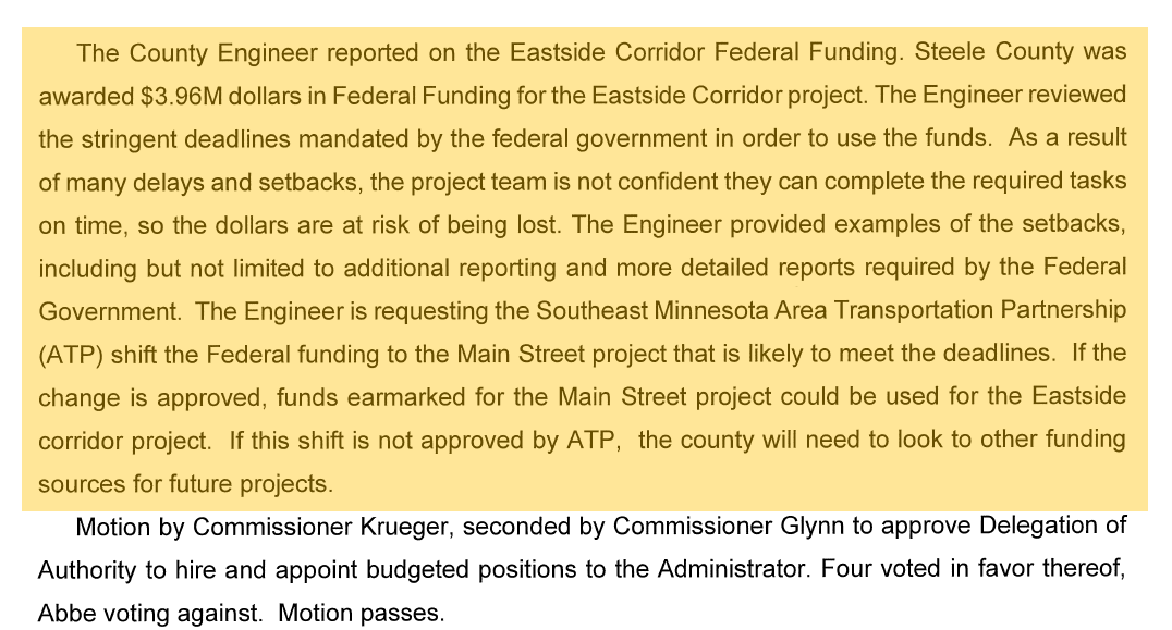 Steele County will be hiring a new County Engineer. Residents are hopeful that new leadership will take the time to review all current projects, engage with stakeholders, and ensure proper oversight, transparency, and accountability moving forward.