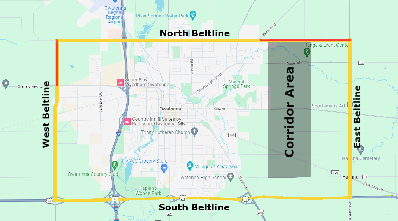 The beltline has been a project in progress for over three decades. Today, we have identified our beltlines, as shown by the rectangle around Owatonna. The red areas indicate where roads are currently missing. This current project focuses on a corridor that will connect 26th St to the north and 18th St to the south, situated closer to the city than the current beltline.Â