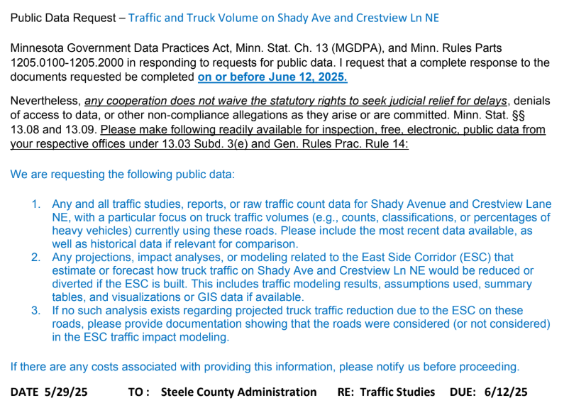 Residents’ Minnesota Government Data Practices Act (MGDPA) complaint was advanced to a formal hearing. At the County’s request, the hearing was split over two days to accommodate the County Engineer’s schedule: October 10 and October 17, 2025.
