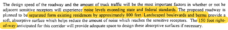 Regulatory Concerns: Previous studies indicated that a road of this type needs to be located 800 feet from subdivisions to comply with noise regulations.