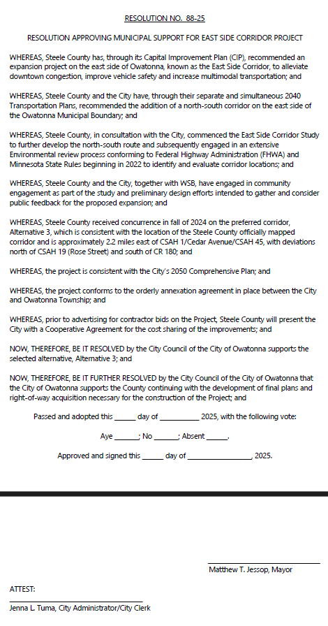 East Beltline MSA Designation Revoked: On August 5, 2013, the City of Owatonna unanimously adopted Resolution 72-13, revoking the East Beltline as a Municipal State Aid (MSA) designated roadway. The action released previously reserved MSA mileage so those funds could be used elsewhere.Â