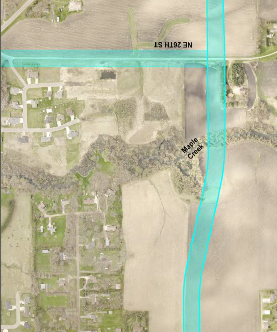 Floodplain: Crosses Maple Creek where it has previously been disturbed by a roadway, as reccomended by the Historical Society in the 90s. The flood plain crossing is much narrower here reducing construction mitigation costs, and once had a historical bridge crossing it (removed in 2005).Â