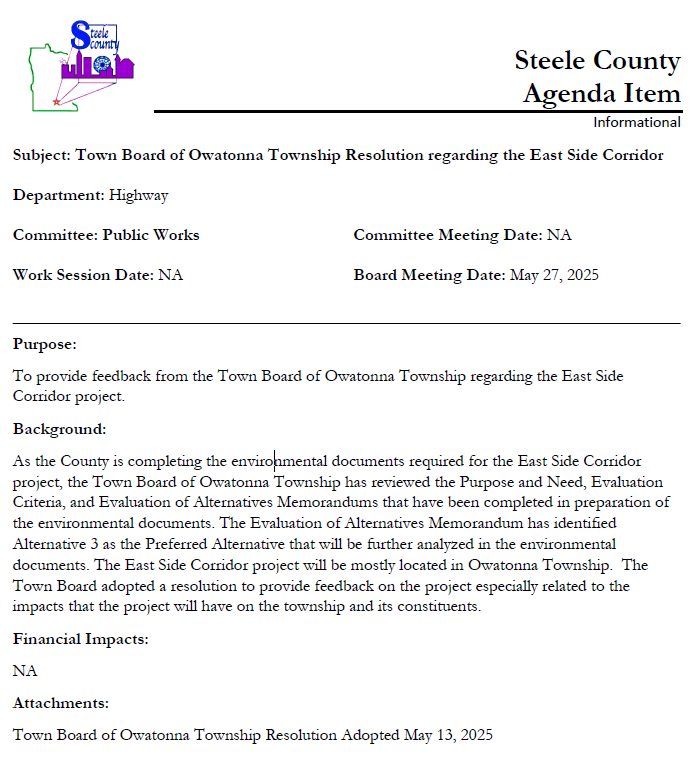 Preferred Alternative Selection: The memorandum, created by WSB, the Steele County consultant, outlines key findings and recommendations regarding the East Side Corridor (ESC) project. However, it contained skewed or biased data, influencing the outcome in favor of certain conclusions or alternatives rather than offering an objective and balanced assessment of all options. This memorandum has prevented us from fully understanding the true costs of alternatives, namely Alternative 4, that meet the criteria based on WSB's own data. Instead of providing a clear, unbiased evaluation, it has further limited transparency and hindered informed decision-making.Â