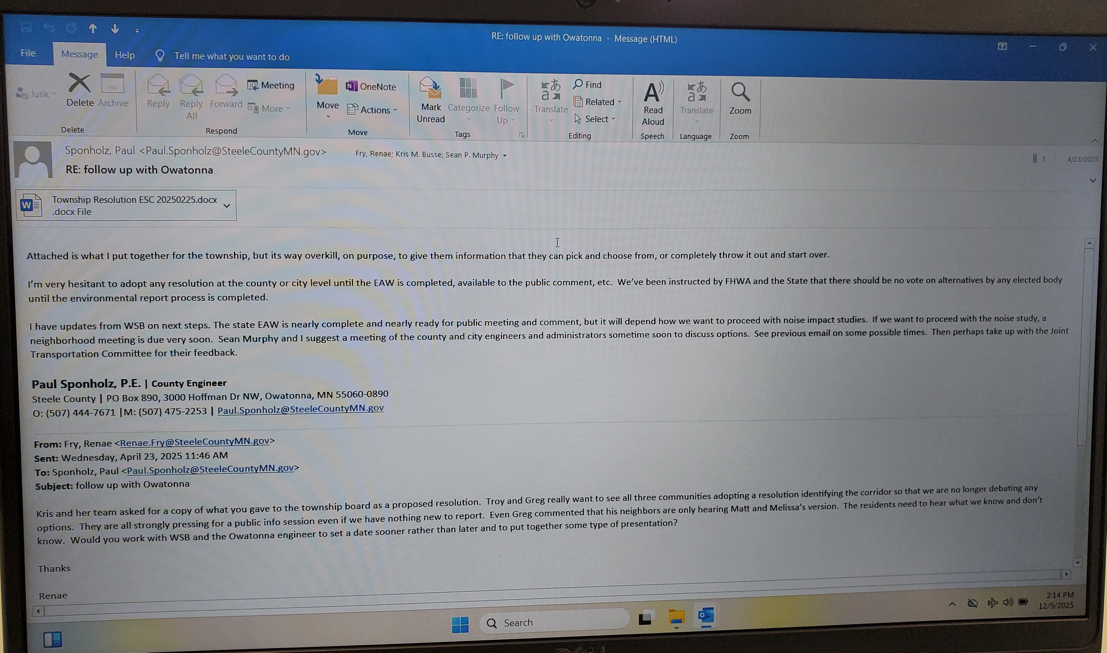 Preferred Alternative Selection: The memorandum, created by WSB, the Steele County consultant, outlines key findings and recommendations regarding the East Side Corridor (ESC) project. However, it contained skewed or biased data, influencing the outcome in favor of certain conclusions or alternatives rather than offering an objective and balanced assessment of all options. This memorandum has prevented us from fully understanding the true costs of alternatives, namely Alternative 4, that meet the criteria based on WSB's own data. Instead of providing a clear, unbiased evaluation, it has further limited transparency and hindered informed decision-making.Â