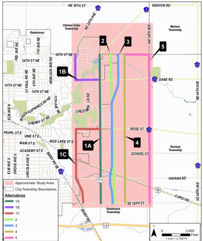 Need for Corridor: The City and County cited a need for a new corridor closer to Owatonna to accommodate traffic between the northeast side of town, the new high school, and Federated Insurance, as well as to reduce pressure on downtown routes. They claimed that some roads—such as Mineral Springs Road—were approaching capacity; however, available traffic studies do not support these claims. While 44th Avenue was expected to help traffic bipass Owatonna, it remains incomplete, so it’s unclear whether it would provide meaningful relief.Â
