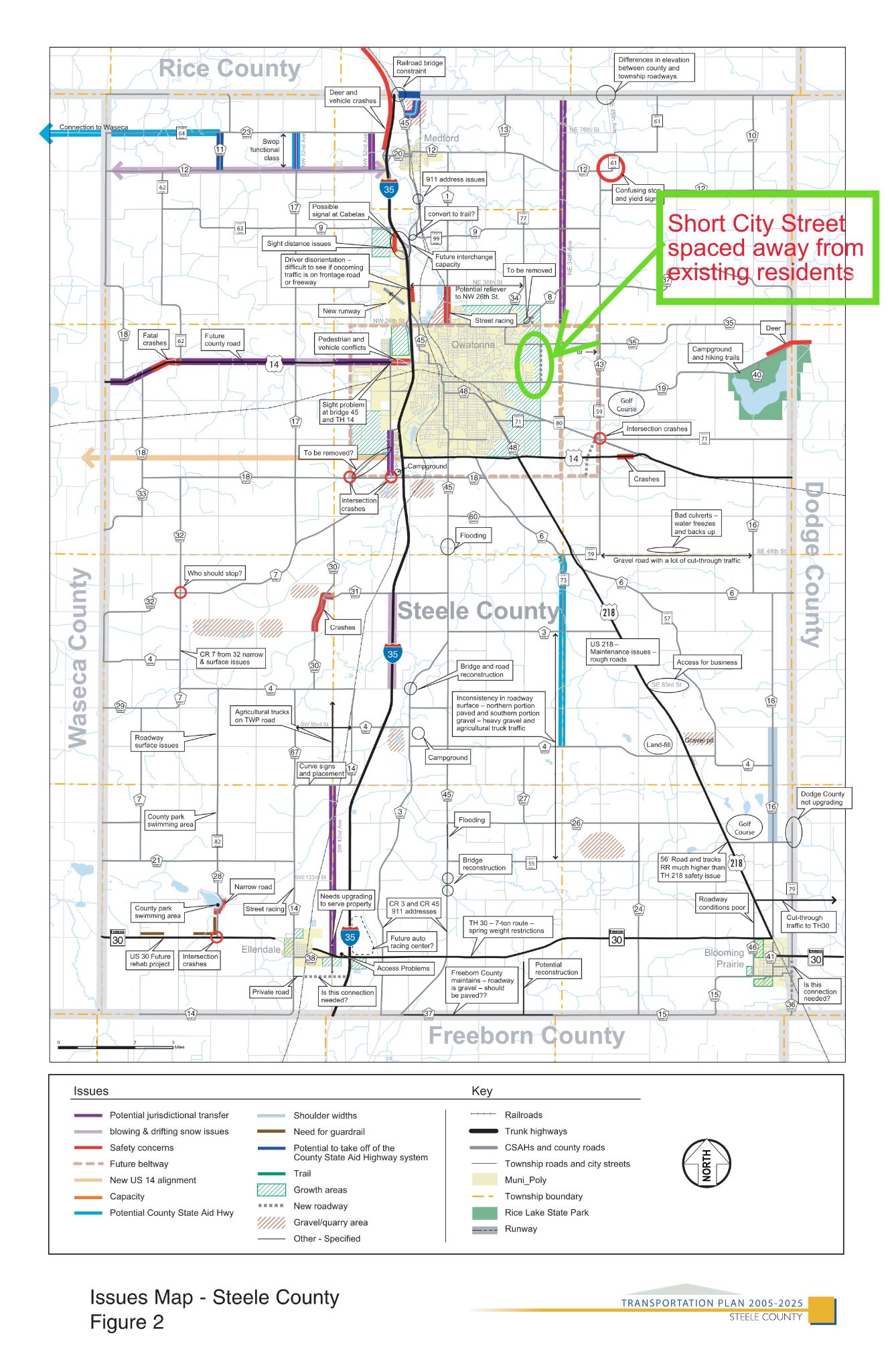 The 2005-2025 Steele County Transportation Plan, outlines plans for the construction of 34th Ave and 44th Ave, while indicating the mapped 29th Ave is no longer part of the plan.Â