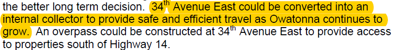 34th Avenue is the most logical choice for the East Side Corridor (ESC), offering a safer solution that aligns with long-term growth and Owatonna’s development plans. It meets noise regulations, protects residents, and as an existing road and owned right of way it prevents significant harm to prime farmland.